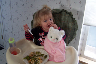 Avery has become attached to her "kitty." This stuffed animal was one I had as a child and Avery loves dragging her around. I set her down on the floor so she wouldn't get dirty while Avery was eating.....and she through the biggest fit. She wanted her kitty to eat by her. So I put a bid on the cat so it wouldn't get so dirty. That really didn't help because Avery kept feeding it. She kept saying "kitty need num nums." I am pretty sure I will be picking rice of this cat 's fur for weeks!